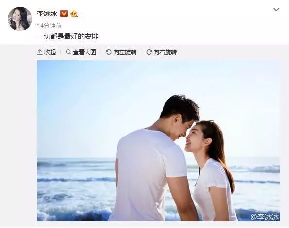 而就在晚上,李冰冰发微博:一切都是最好的安排。承认了恋情!