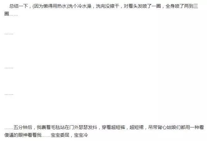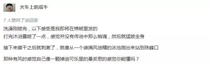 就是.......洗完澡……喷一些……感觉喷的少……不凉……多喷点……用水冲一下……擦干……过了一会……卧槽!凉!不是冷!是凉!那种感觉你懂吗!就是其实温度很热!但是你感觉不到!就感觉被喷到的地方!特别凉!如果你喷多了!会感觉凉到疼!没错就是这种感觉!