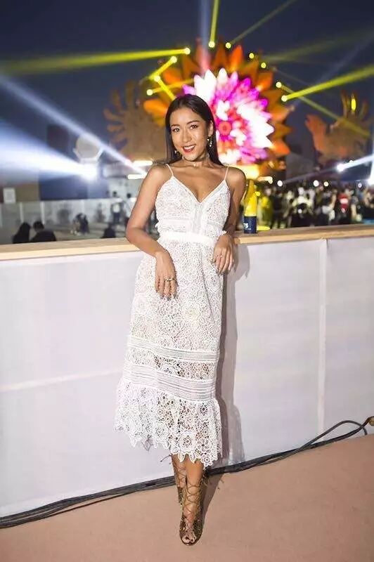 一件白色的吊带长裙,蕾丝镂空的设计增加了性感的效果,古铜色的肤色加上微微的肌肉,整个人看起来有种力量感,和普通女孩的蕾丝裙效果对比很明显。