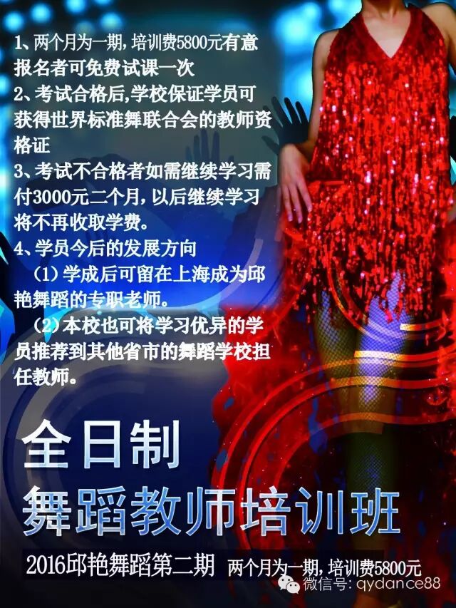 2 两个月学期结束,经考试合格后可获得邱艳舞蹈颁发的毕业证书(无需费用),学校保证学员可获得世界标准舞联合会的教师资格证(拉丁舞国家C级教师证考试费自理¥1500)。