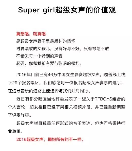 声明中明确表示节目尊重任何形式的音乐表达,并对部分唱区评委与TFBOYS有关的个人言论给出了解决方法,节目组表示超女栏目已下架相关视频,并重新调整了评委阵容。