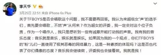 然而该评委25日在个人微博上发文表明自己并没有做错什么,称其作为评委会对节目负责,想听到有诚意的声音,并质问TFBOYS粉丝对自己使用网络暴力是否代表了偶像的态度。