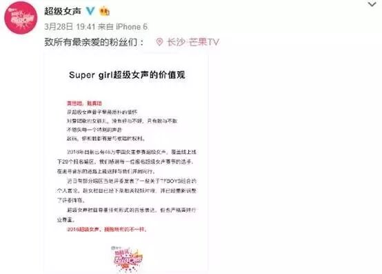 当晚7点多超级女声官方微博发布了一封名为《超级女声的价值观》声明并致所有亲爱的粉丝。