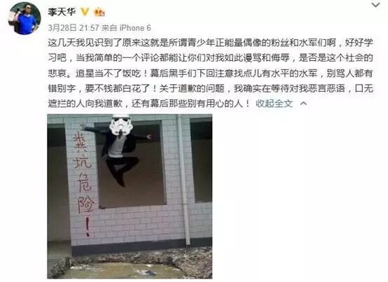 28日晚9点多疑似已经被解除超级女声评委身份的李天华怒气值爆棚,在微博发布了一张有粪坑的图片疑似暗讽与TFBOYS有关不雅称呼。
