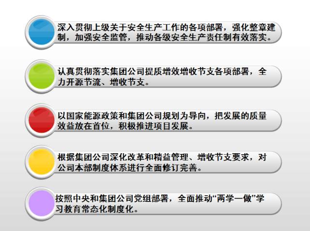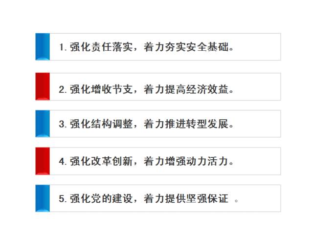 未来一个时期,我们要认真贯彻落实党中央、国务院以及集团公司各项决策部署,深入践行“创新、协调、绿色、开放、共享”五大发展理念,坚持稳中求进、进中调整、实现可持续发展的总基调,顺应能源发展趋势,遵循价值思维理念,以加强党的领导为统领,以坚持以人为本为原则,以质量效益为中心,以改革创新为动力,以作风建设为抓手,全面推进公司安全工作本质型、经营工作精益型、管理工作创新型企业建设,力争早日建成法治化、市场化、集约化、清洁化、信息化的一流能源上市公司。
