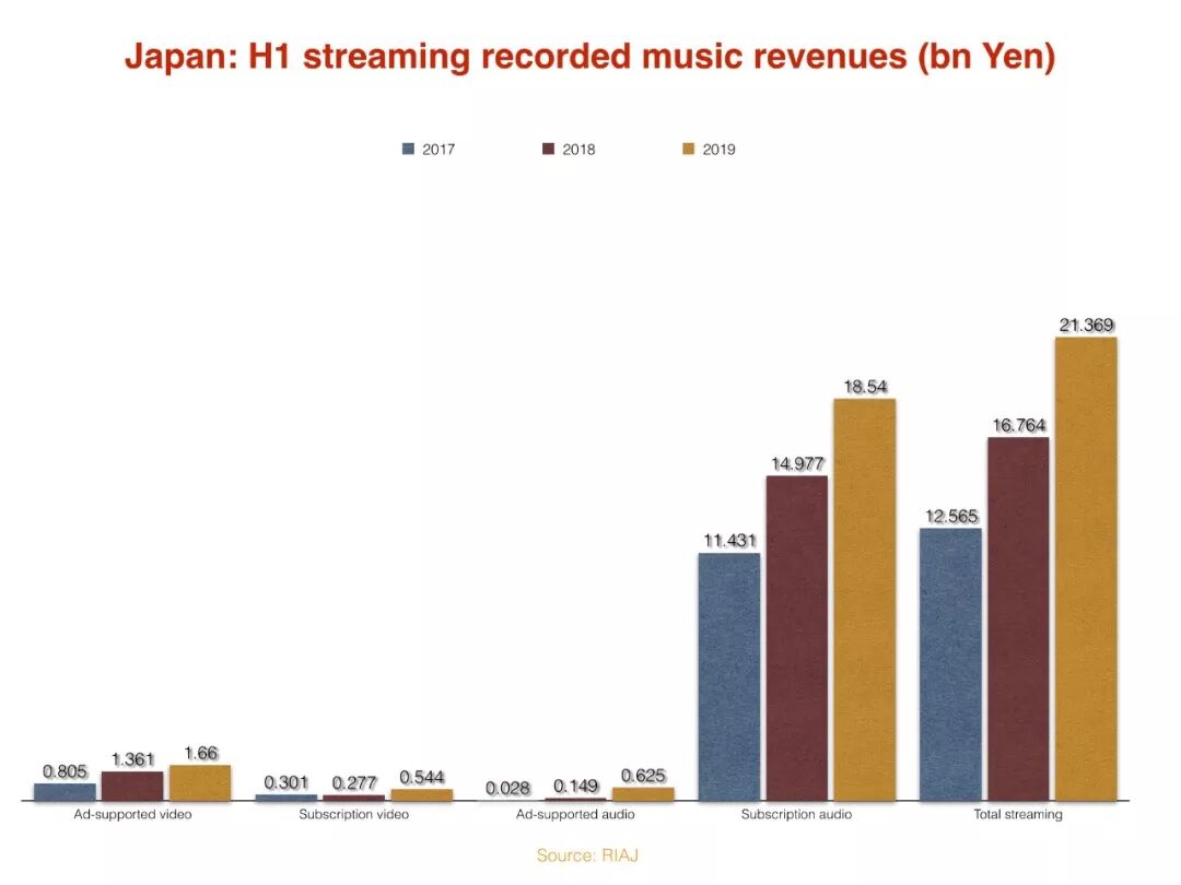 2019年上半年,日本流媒体收入同比增长略快于2018年上半年,订阅音频流媒体收入跃升35.6亿日元,增幅略高于2018年上半年的35.5亿日元,但若以美元为单位,按每年的现行汇率换算,2019年上半年日本流媒体收入增长实际上也在放缓。