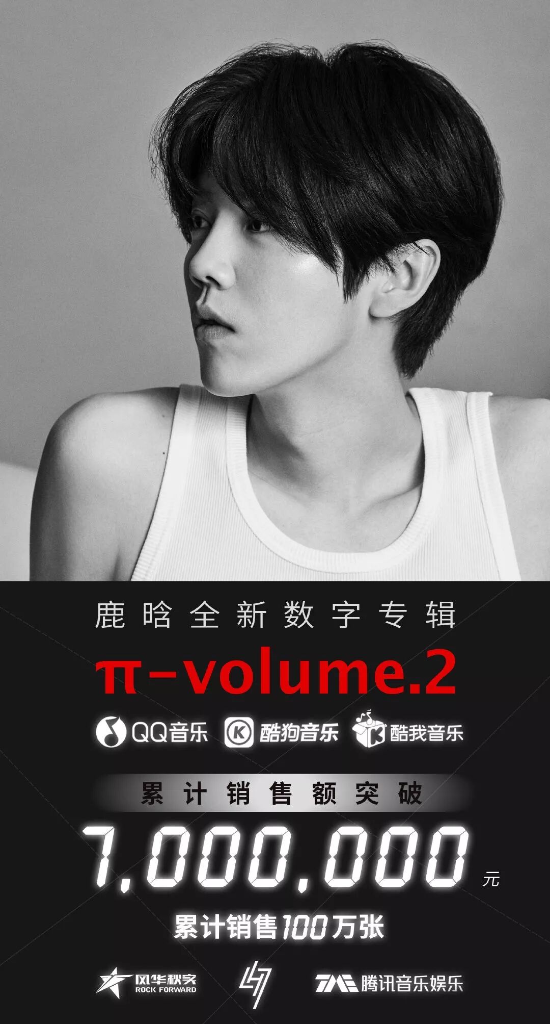 ·8月27日,鹿晗全新MINI 数字专辑《π-volume.2》浪漫登陆QQ音乐、酷狗音乐、酷我音乐三大平台开启预售。截止29日上午10时,QQ音乐、酷狗音乐、酷我音乐累计销售额突破7000000元!该专辑已于30日起正式发售。
