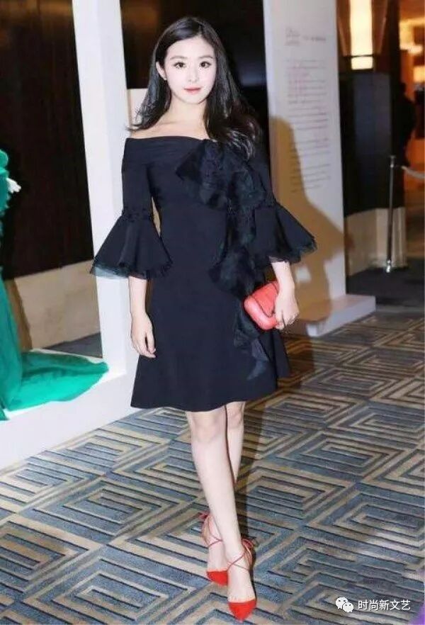 一身黑色斜肩礼服,露出漂亮的锁骨,大大的喇叭衣袖显得很淑女。裙摆拖到膝盖上,脚踩橘色系带高跟鞋,气质满满。