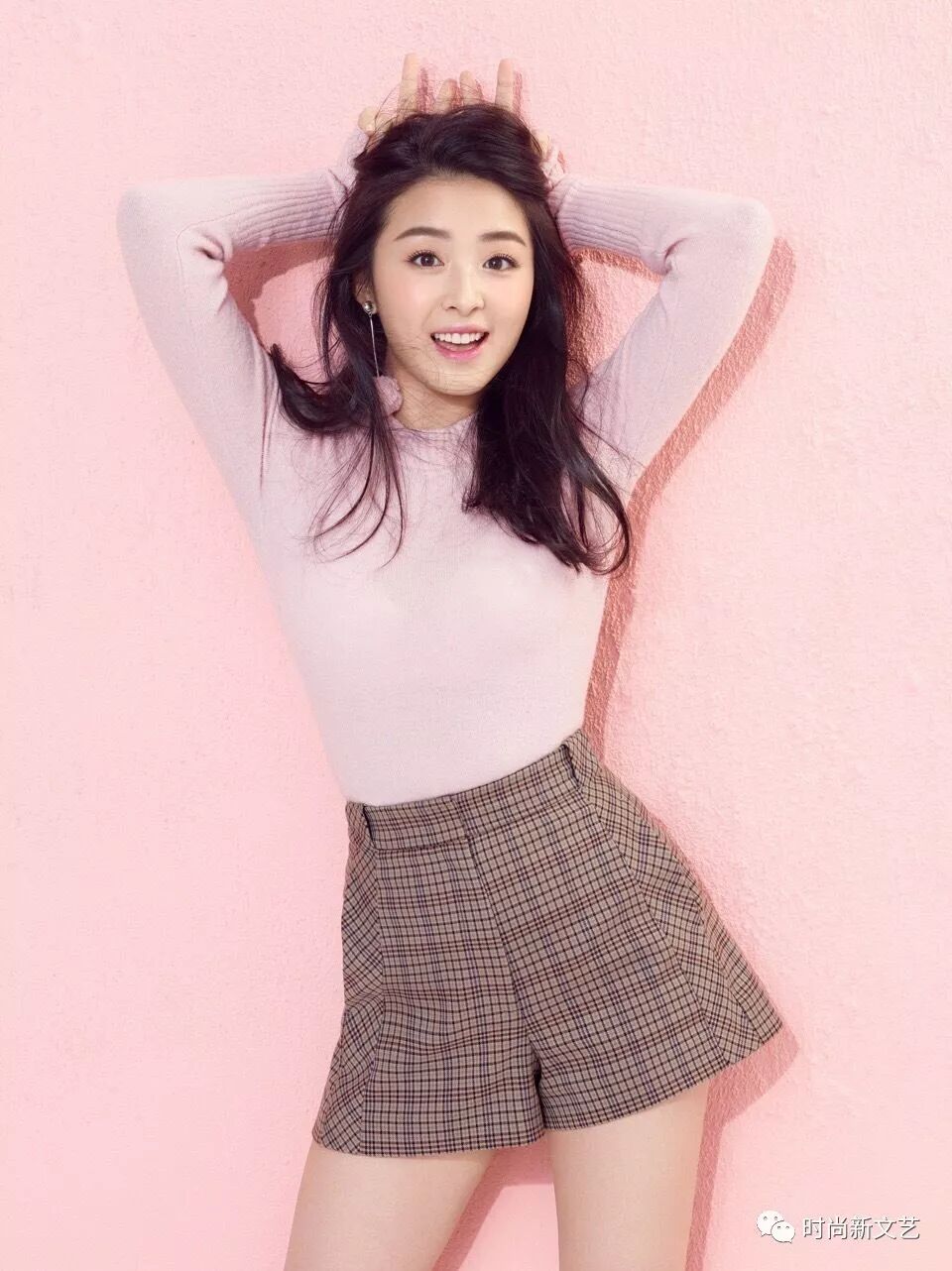 粉红色修身针织上衣,勾勒出纤细腰肢和凹凸有致的身材,下搭棕色格纹短裤。圆嘟嘟的脸蛋笑起来非常可爱。