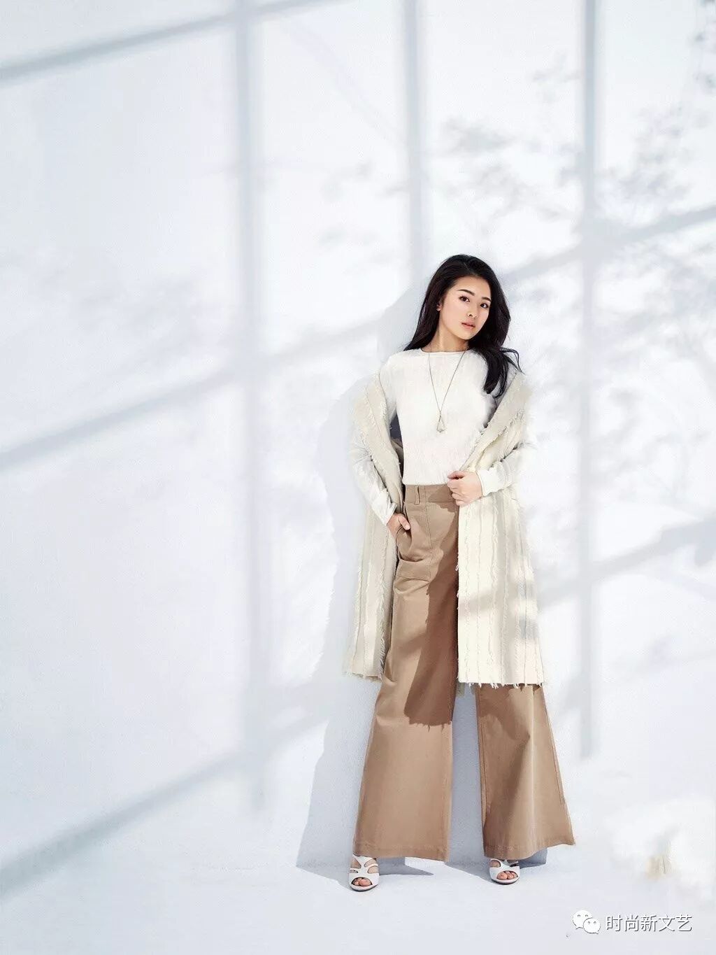 一件白色修身内搭,外穿白色大衣,下身搭配卡其色阔腿长裤,脚踩白色高跟鞋。这身搭配挺高明的,高腰阔腿裤显得腿长。
