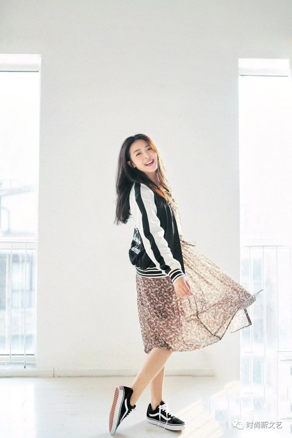 一袭棕色印花连衣裙,裙摆拖到膝盖,外穿一件黑色运动服外套。脚踩黑色运动板鞋。长发批下来,裙子随风扬起,非常淑女。