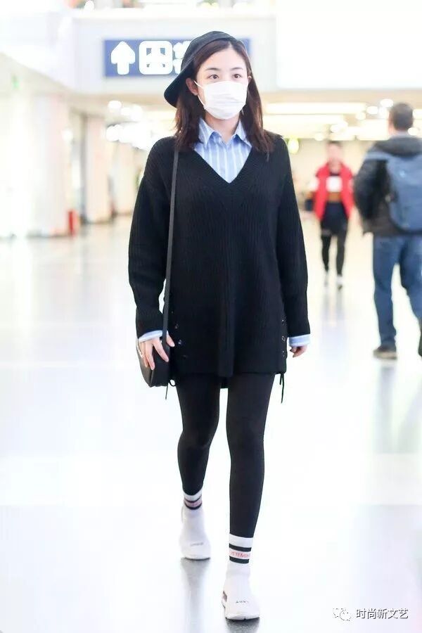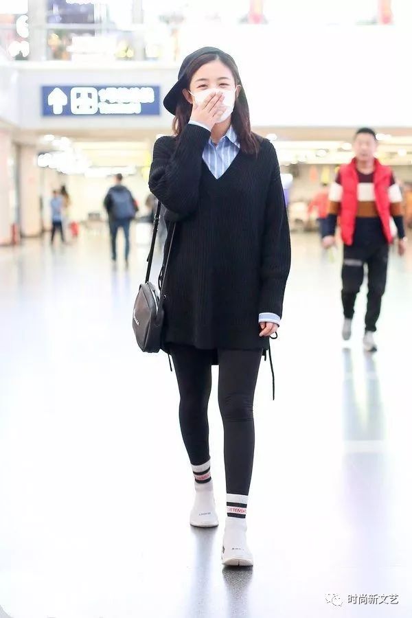 黑色毛衣盖到大腿,下身黑色紧身裤,这不是把秋裤穿出来了吗?脚上的白色运动袜扎住裤腿,穿着白色运动鞋。