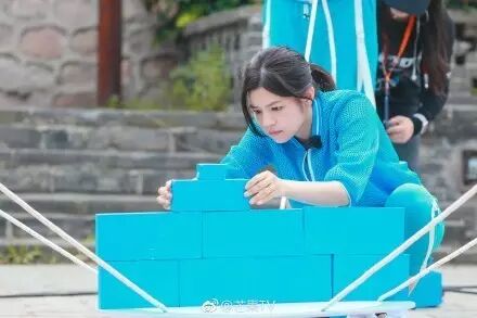 ▲在另一组剧照里,一身蓝色运动装的陈妍希,直接席地而坐,一脸严肃地投入玩游戏。