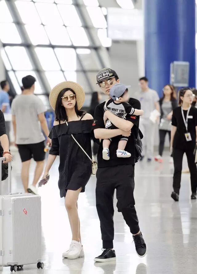 ▲最近在机场被拍到的一家三口有爱画面里,陈妍希也身穿一件简单的黑色露肩衬衫裙。