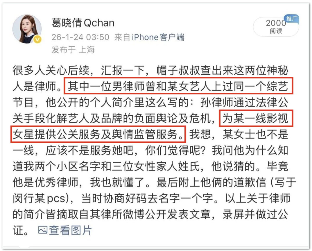 后查出是俩律师干的,有一个疑似跟张雨绮一起上过综艺,公开简介写「为某一线影视明星提供公共服务和舆情监管服务」。