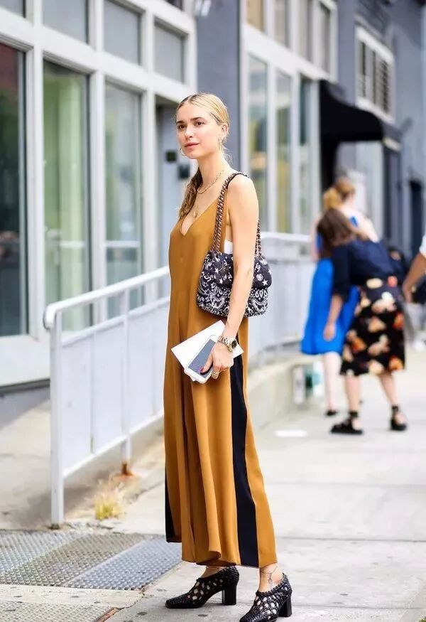 穿长裙时,显矮的原因有很多,其中一个就是长裙面积太大,让下半身看起来太闷太沉重,所以露肤可以起到中和的作用,其中露出最纤细的小腿和脚踝是最管用的。