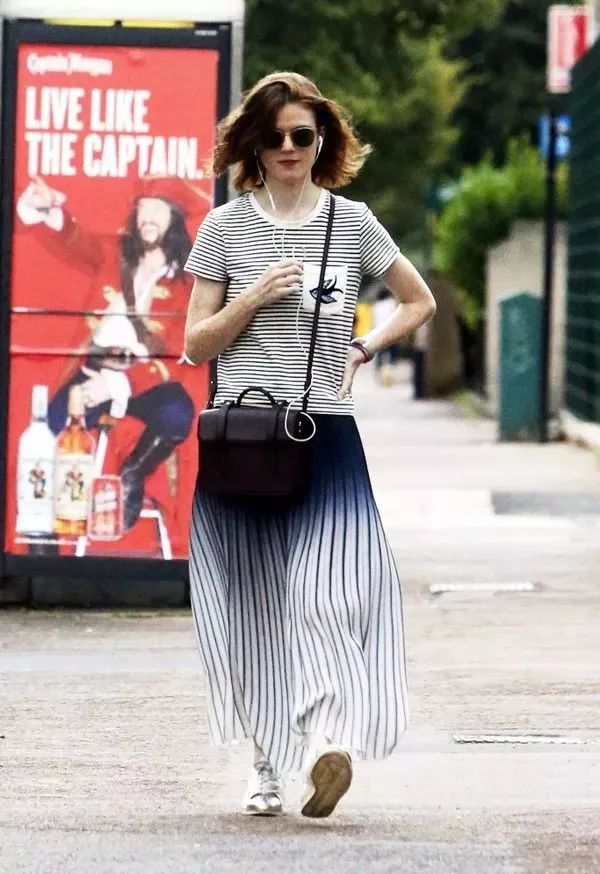 再热一点,大家可能就像Rose Leslie这样一条长裙+一只包包就出门了。这个时候要注意,包包要是那种肩带不长的,不然背上也会压身高。