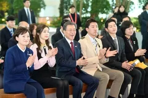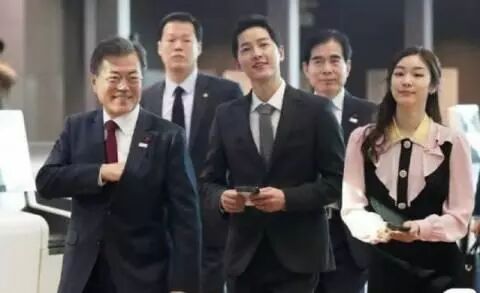 当天宋仲基穿着一身帅气笔挺的西装,陪伴在文在寅总统身旁,仿佛“柳大尉”陪伴出巡。