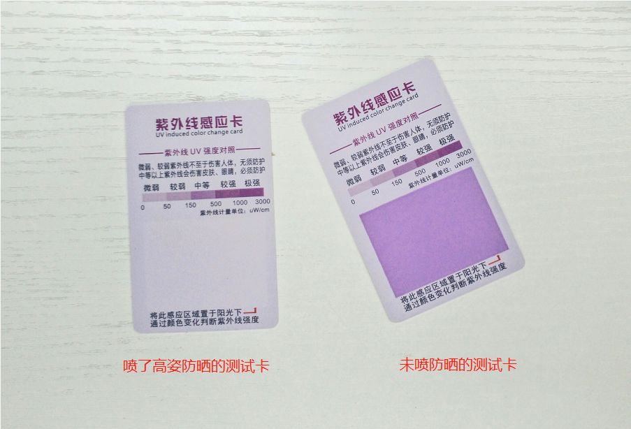 司司作为防晒研究技术流,做防晒紫外线测试是必须的了。看看刚从太阳下拿回来,迅速拍照记录的两张测试卡。