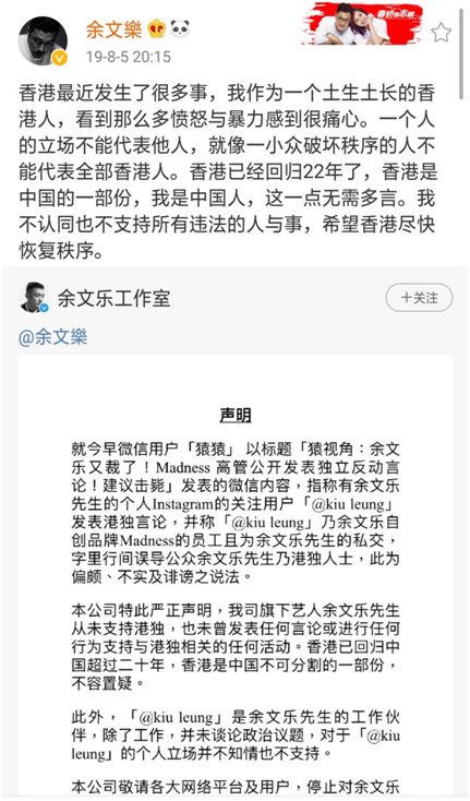 随后余文乐工作室对此发声明表示,这是偏颇、不实及诽谤的说法,余文乐从未支持“港独”,也未曾发表任何言论或进行任何行为支持与“港独”相关的任何活动。余文乐随后在微博转发其工作室声明并表示,香港是中国的一部分,自己是中国人,这一点无需多言。
