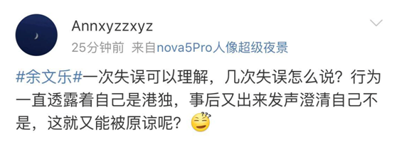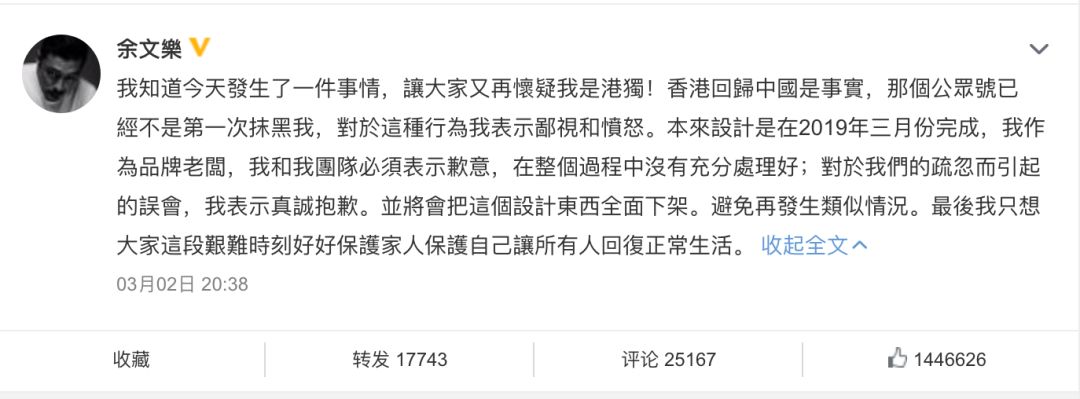 晚间,余文乐也在微博回应:“今天发生了一件事情,让大家又再怀疑我是‘港独’!香港回归中国是事实,那个公众号已经不是第一次抹黑我,对于这种行为我表示鄙视和愤怒。”