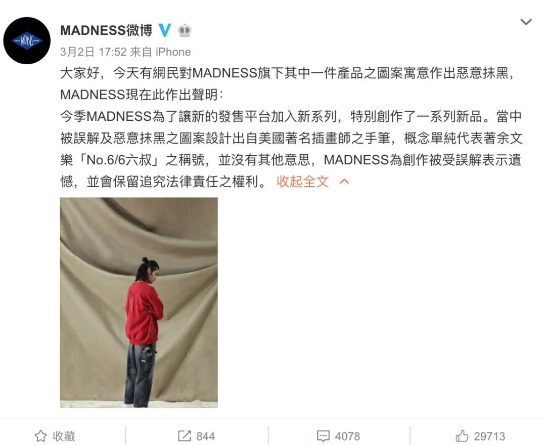 这次余文乐因卫衣图案再次陷入支持“港独”的争议,针对有网友对图案的质疑,昨天下午,MADNESS在微博回应称此是“恶意抹黑”: