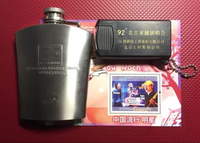 上面的是崔健演唱会的周边产品,左边的是酒壶,那个像BB机的是小手电筒,底下的那个是邮票,上面还印有周杰伦,打着许巍的名字还印了台湾明星许玮伦....