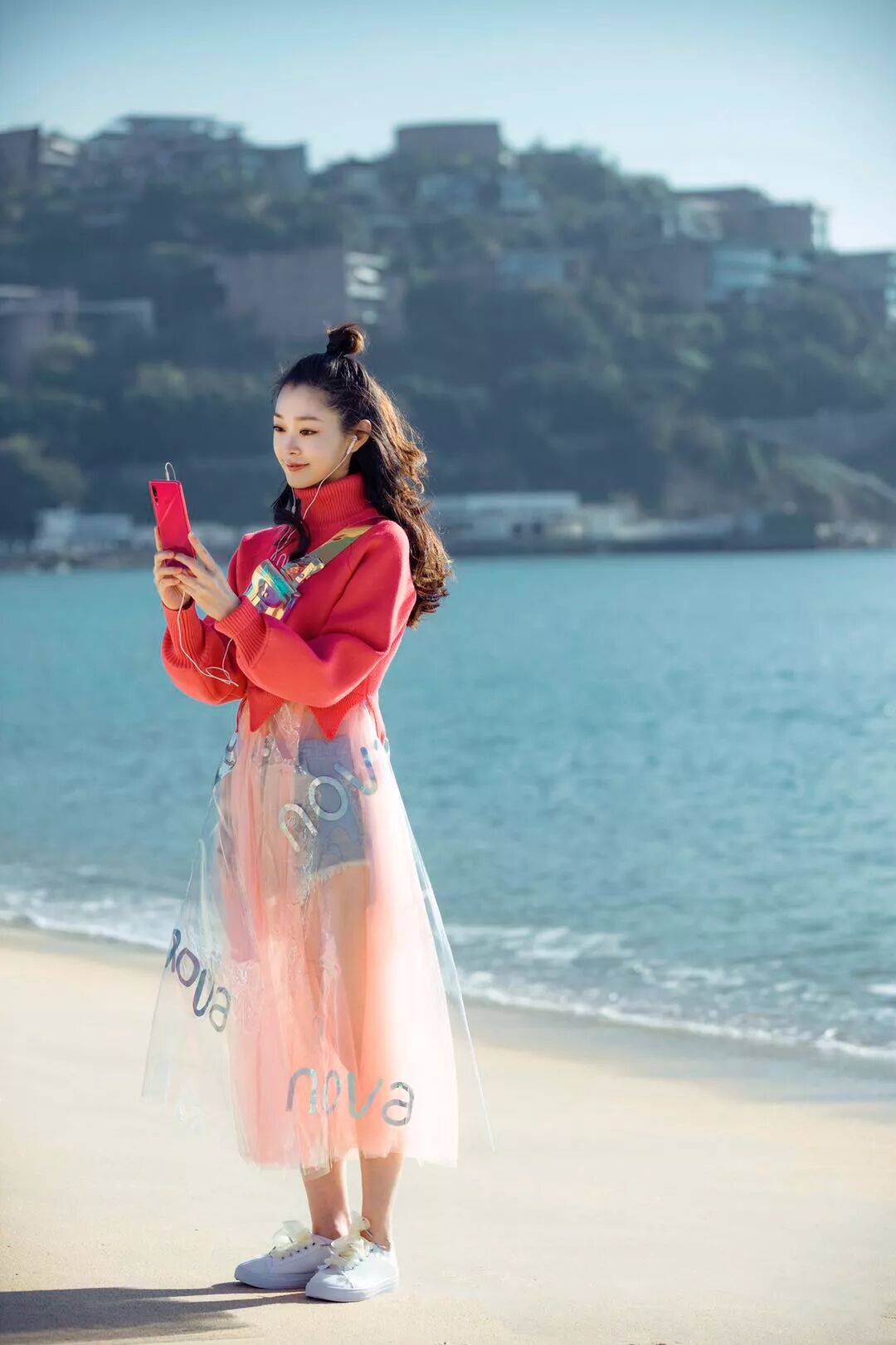 蔚蓝海面背景打底,廓形硬朗的高领毛衣、整片蜜语红色彩的运用、蜜语红手机、胸前的镭射包、还有她小有名气的“丸子头”,这些要素都让宋轶整个人看起来甜美俏皮,还带着一丝丝冷艳的仙气。