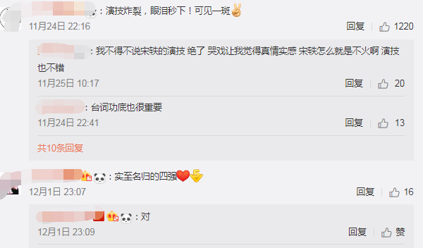 《我就是演员》选四强那天,宋轶因为不少网友吐槽宋轶戏份太少看不够上了热搜,打开评论一看,除了惋惜,网友们也都肯定了宋轶的实力,也不乏“演技炸裂”这样的评价。