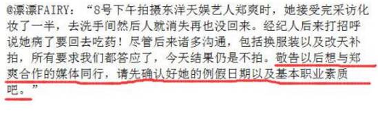 2012年3月,《精品购物指南》编辑在微博中曝出郑爽合作时耍大牌,化妆进行到一半便无故消失,质疑其职业素质。