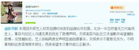 随即,张翰在微博上为郑爽抱不平(请注意时间,是在2012年),张翰称郑爽中途离场是因对杂志安排她拿某品牌手机拍封面不满。(“天娱小仙女”梗也是在这里出现的)