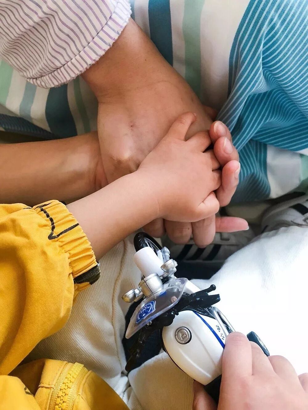 他费力表达,拜托孩子妈妈去买了玩具车,然后藏在自己枕头下面。等儿子来了,他就吃力地掏出玩具车,递给孩子,再去握住儿子的小手。