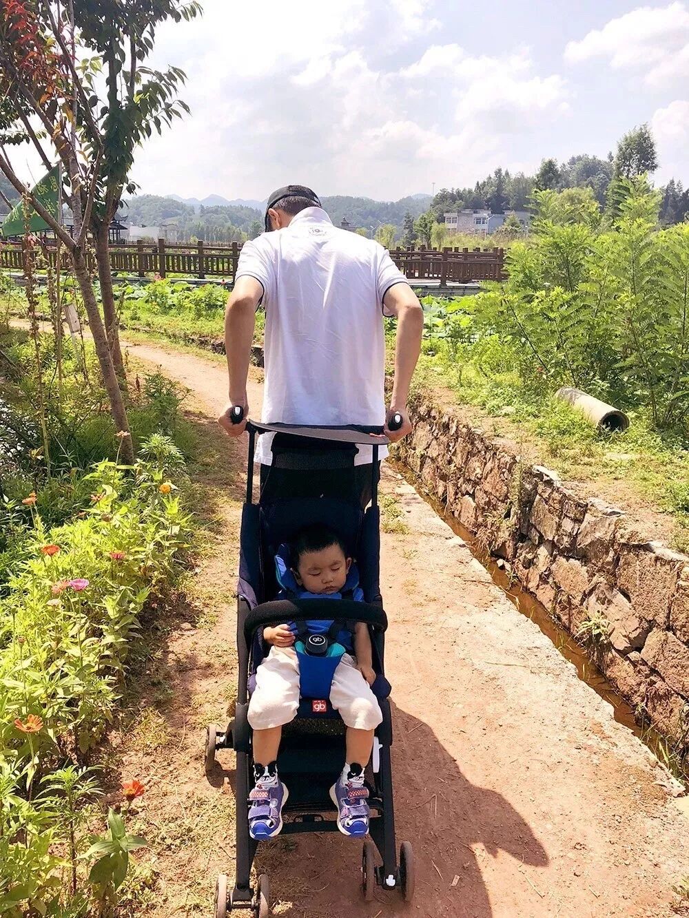 爸爸拖着病体走在户外,太阳毒辣,儿子却睡的香甜,因为有爸爸用宽厚的后背给孩子遮阳。