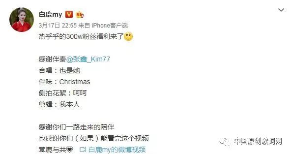 白鹿在唱歌视频前面写了一段文案,她是这样写的:“热乎乎的300w粉丝福利来了,感谢伴奏@张鑫_Kim77。合唱:也是她;伴味:Christmas;侧拍花絮:呵呵;剪辑:我本人。感谢你们一路走来的陪伴,也感谢你们(如果),能看完这个视频,茸鹿与共!”白鹿在这段文案中首先说明了本段视频是给大家的300万福利,同时她也表达了对伴奏“张鑫”(《招摇》中东山主路十七的扮演者)的感谢,最后她也向广大粉丝表示了感谢!