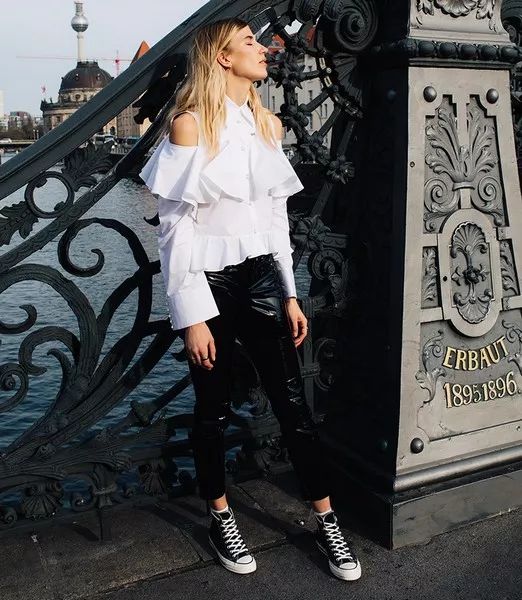 公主风的荷叶边自带淑女气息,用黑色漆皮裤和帆布鞋来中和,娘和man的碰撞就能打造出特别的时髦效果