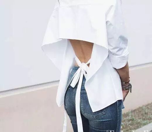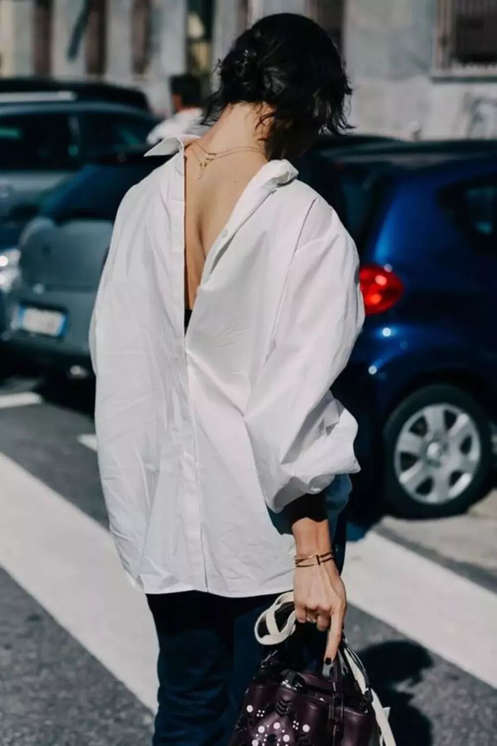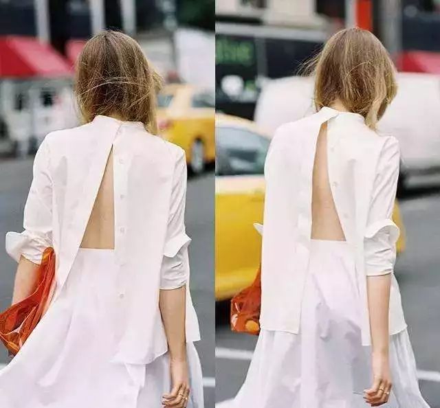 但今年更进阶的穿法是在衬衫的背部做文章,比如结打在后面