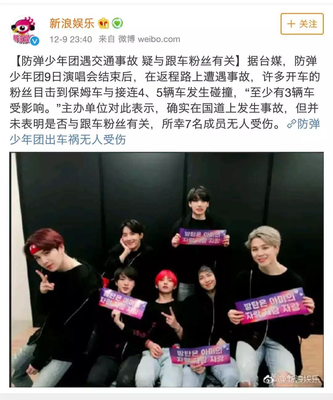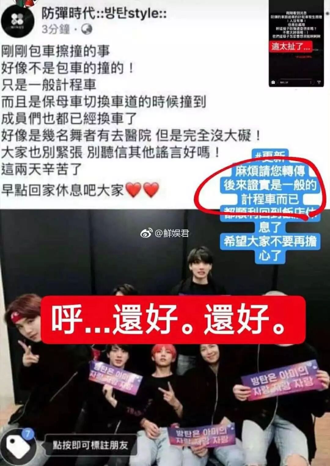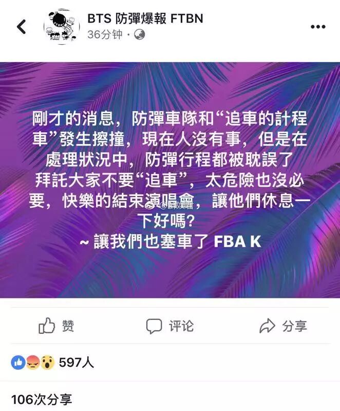 上个周末,防弹少年团在中国台湾举办了两场演唱会,结果在昨天演唱会结束,大家回家的路上,不小心发生了交通事故。