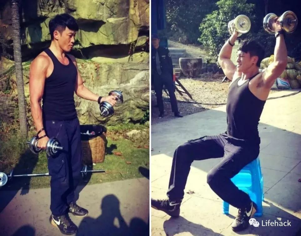 拍戏忙的时候,他干脆把剧组当成自己的训练场,随身带着杠铃哑铃,拍摄间隙就练一练,让肌肉时刻处于兴奋状态!