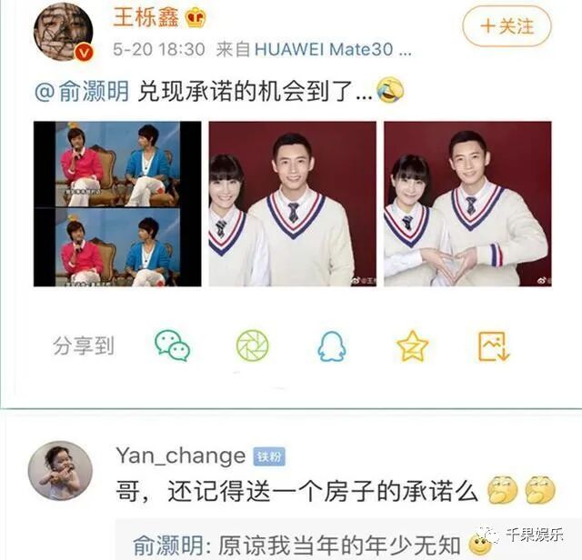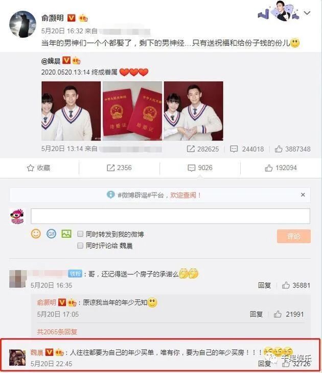 当年的时候在采访的时候,主持人问俞灏明,魏晨结婚的时候你会送什么礼物给他,而俞灏明也是表示,如果我有钱的话,我会送他一套房子,当时很多人听到这句话的时候,也是纷纷的投来了羡慕的眼光,而当魏晨昨天官宣结婚这个好消息的时候,有网友也是在底下调侃,不知道你是否还记得送一个房子的承诺,而俞灏明也是回应到原谅我当年的年少无知,不得不说,俞灏明也真的是一个非常可爱的人了。当然这都是他们朋友之间的玩笑话。