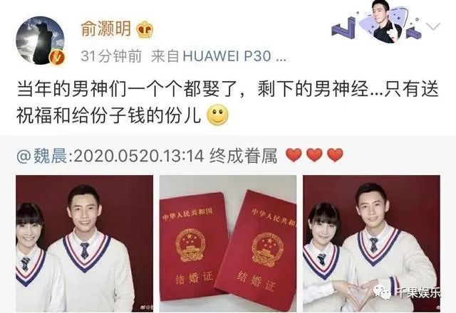 就在前天的时候,07年的快男魏晨也是官宣了自己结婚的好消息,而07年的快男也是纷纷的送上了祝福,俞灏明也是配文发到:当年的男神们一个个都娶了,剩下的男神经只有送祝福和给份子钱的份儿,大家也都知道,俞灏明也是因为一些事情导致了自己的事业发展,所以现在的他也是单身一个人,一直没有找到适合自己的另一半。