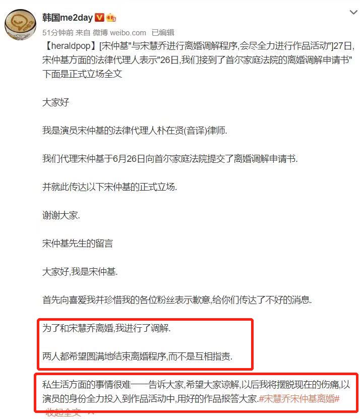 不过,也有网友指出是翻译错误,不是“为了和宋慧乔离婚进行调解”,而是“和宋慧乔离婚的调解正在进行”。