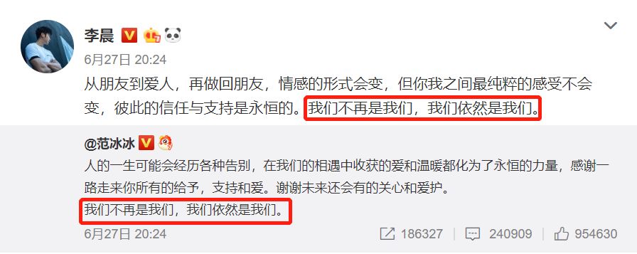 他们的分手文案依然使用官宣恋情的“我们”体,完美诠释了首尾呼应,被调侃“满分作文”。