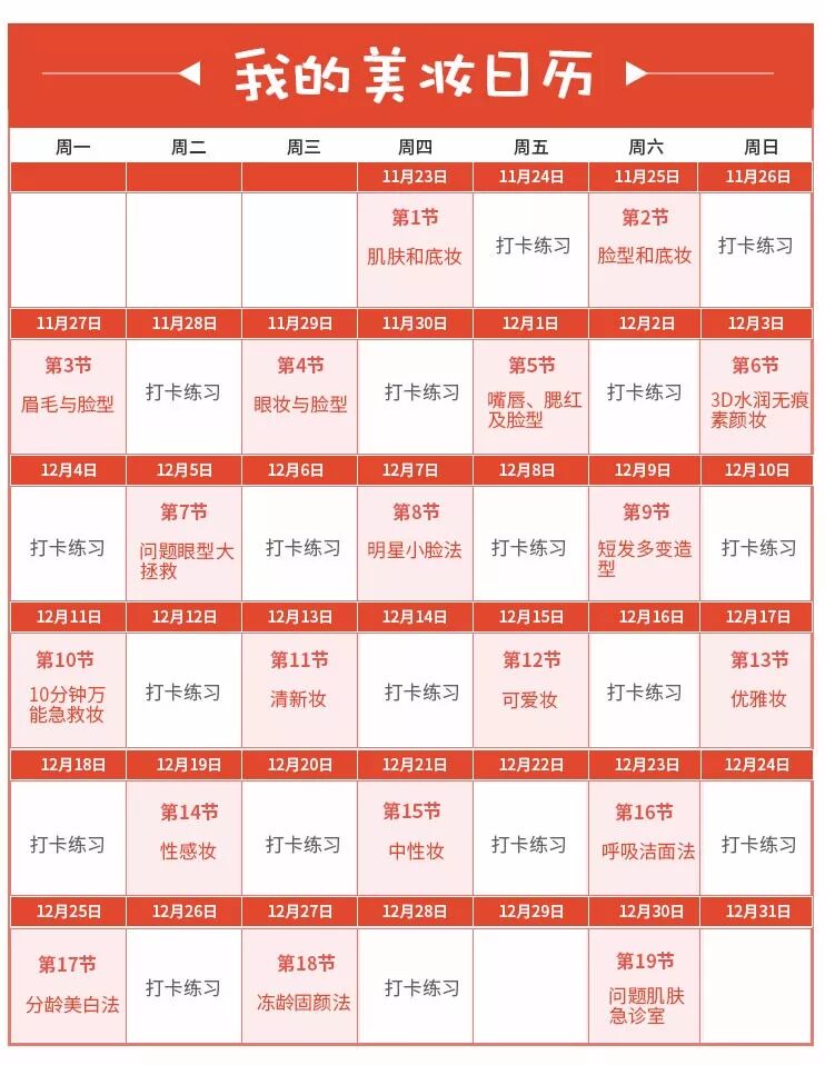 4、专属你的美妆日历:课程逐一更新,从自己适合什么妆容,到如何去画,再到不同风格的妆容,制定专属你的美妆日历,让你越学越漂亮!
