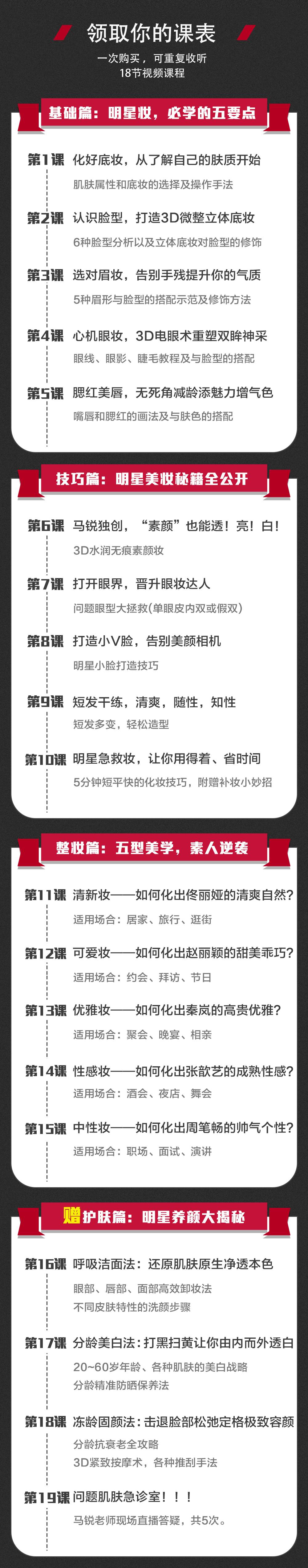 5、课程体系科学完善,没有你搞不定的美妆:底妆、眼妆、唇妆、5节明星美妆秘籍、5套超实用的五型美学技巧妆,无论你是什么角色,妈妈、老师、妻子,都可以满足你!