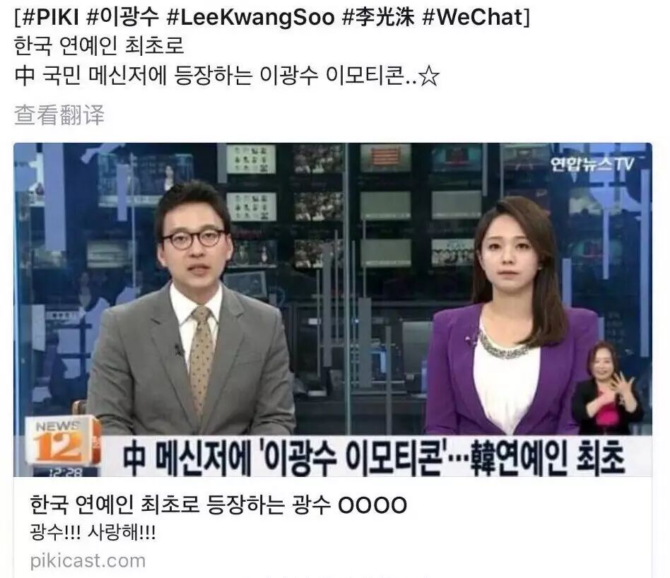 韩国男星李光洙,因在综艺节目《Running Man》中艺能感十足的表现,让他红遍全亚洲,被封为“亚洲王子”。5月3日,有贴图制作公司,相中了他的活泼形象,特别以他为主角制作了贴图,并在中国大陆最大通讯软件“微信”上发布,而他也成为第一个在微信上被制作成贴图的韩国艺人。