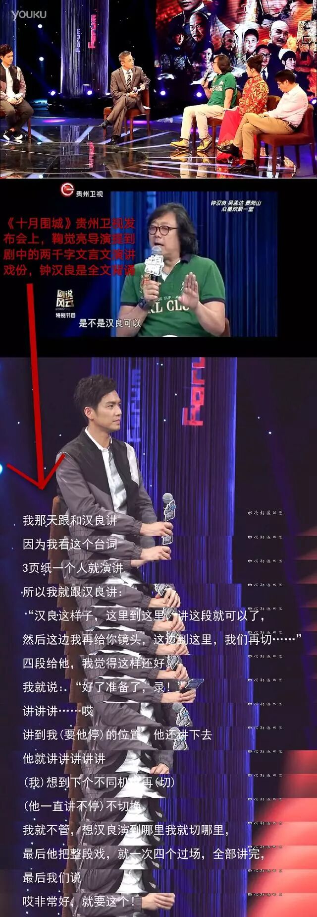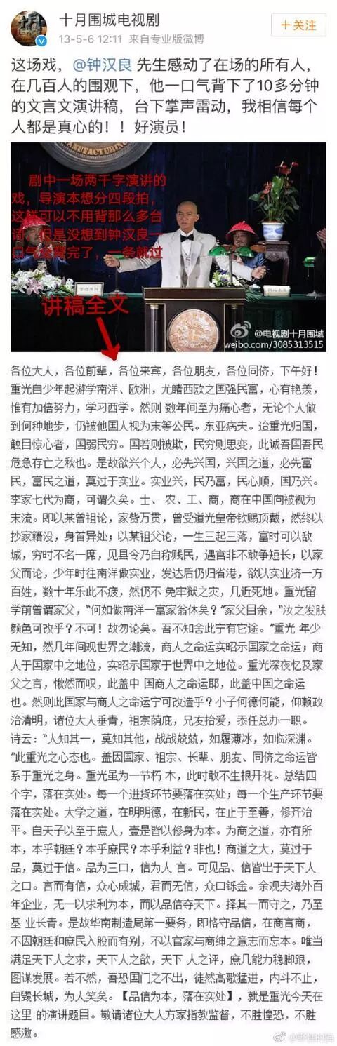 在拍摄电视剧《十月围城》的时候,一场两千字(还是文言文台词)演讲的戏,导演本想分四段拍,可是钟汉良一口气演完了,全部台词一字不落的背了下来,这场戏一条就过了,令导演和合作演员赞叹不已。