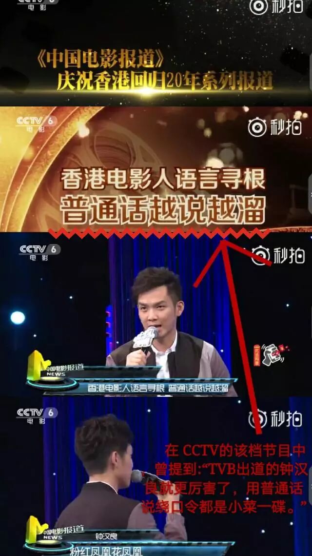 CCTV6的一档节目中谈及在内地发展的香港籍艺人说普通话,是这样评价钟汉良的,节目里的旁白说道:【TVB出道的钟汉良就更厉害了,用普通话说绕口令都是小菜一碟】,香港人语言寻根,普通话越说越溜的代表人物就是艺人钟汉良。
