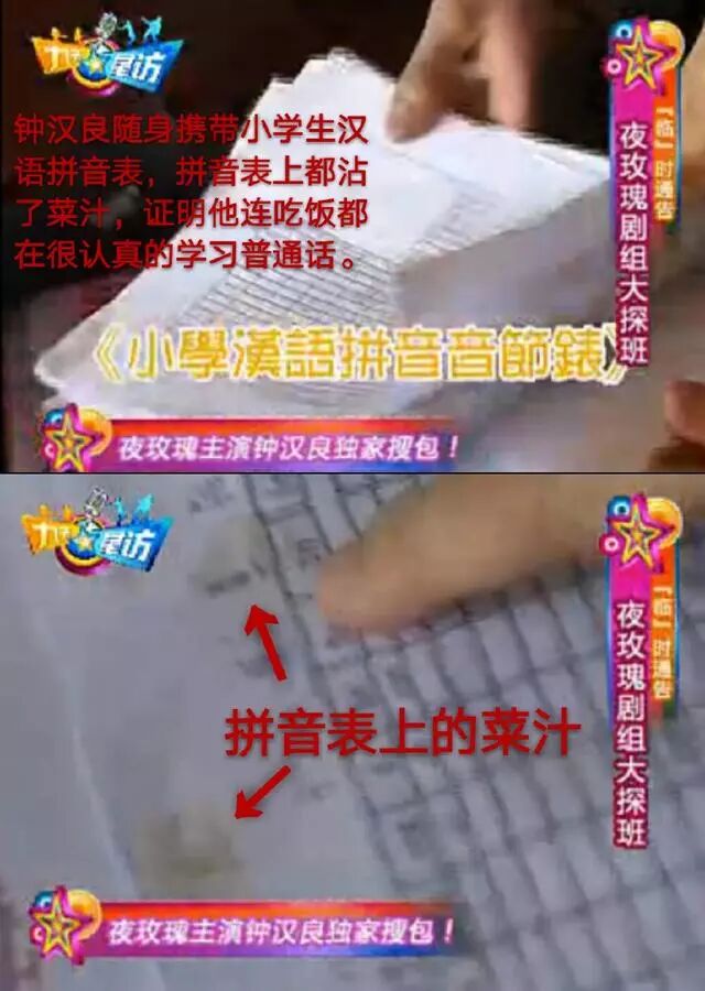 其实钟汉良的普通话之所以越来越好,与他平时的努力是分不开的。大家都知道,在日常拍戏、访谈以及和合作者的交谈中他一直是用普通话的,并且在他初来内地发展的时候,专门请了语言老师指导普通话,随身携带《汉语拼音表》,片场路透无意中拍到他的拼音表上沾满菜汁,足以证明他连吃饭休息都在学习普通话,是何等的认真啊。
