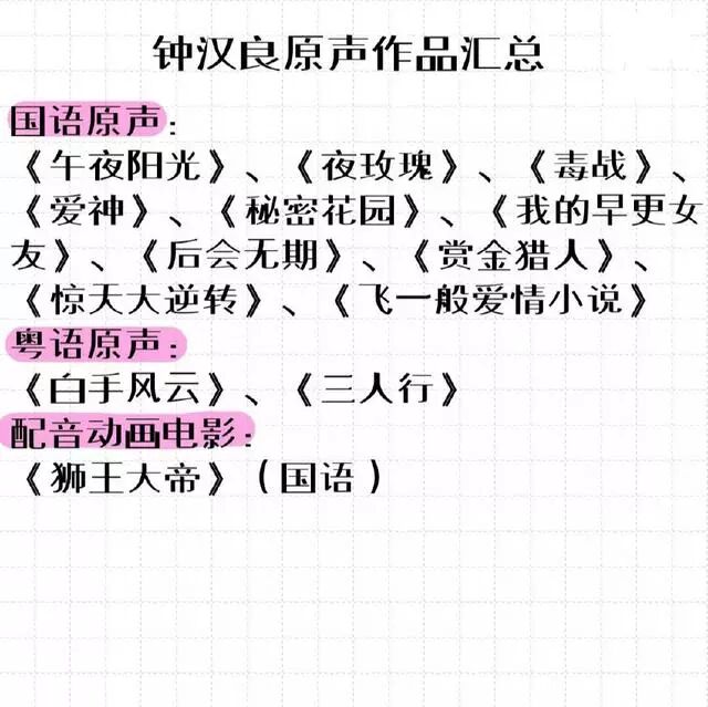 钟汉良原声作品列表:国语原声:《午夜阳光》、《夜玫瑰》、《毒战》、《爱神》、《秘密花园》、《我的早更女友》、《后会无期》、《赏金猎人》、《惊天大逆转》、《飞一般爱情小说》;粤语原声:《白手风云》、《三人行》;配音动画电影:《狮王大帝》。