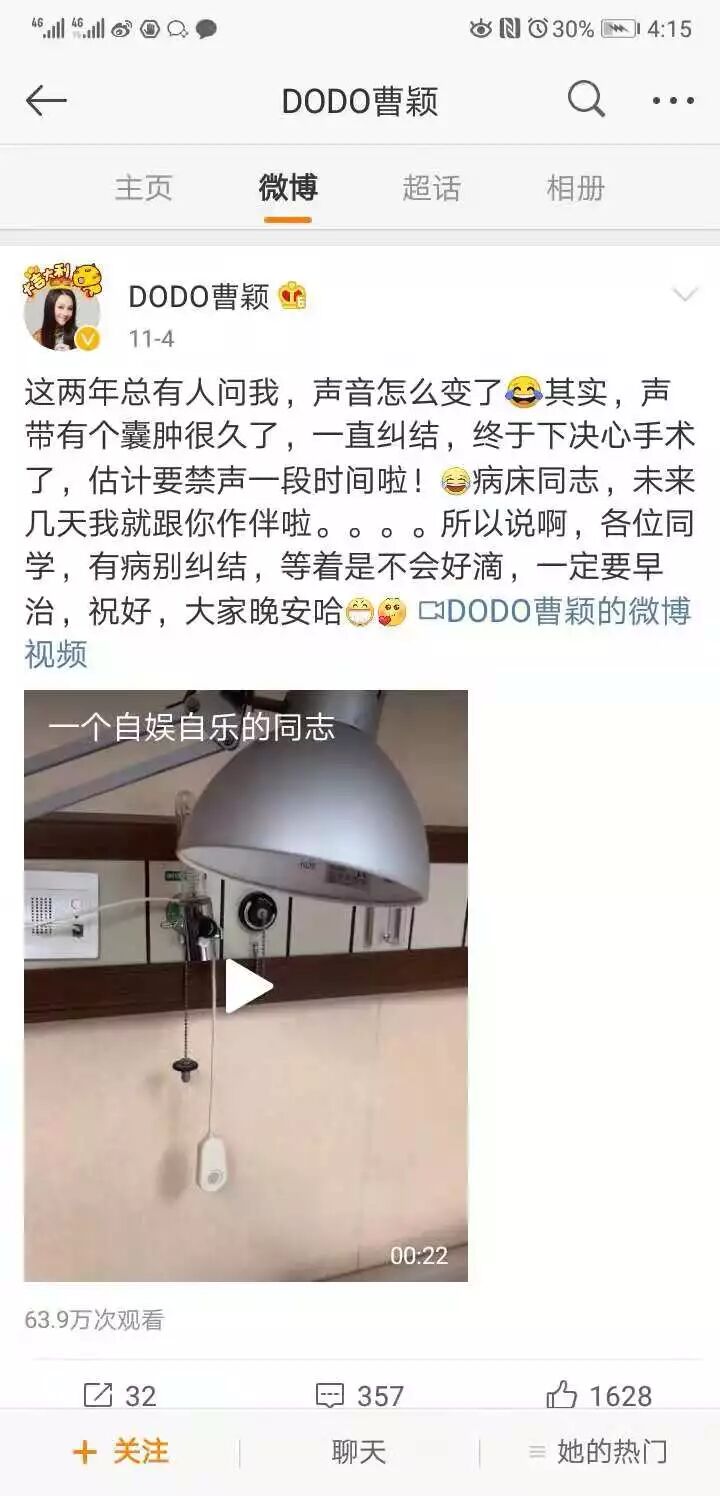 曹颖在社交平台上说“这两年总有人问我声音怎么变了?其实声带有个囊肿很久了,一直都在纠结,终于下定决心手术了,估计要禁声一段时间。所以说各位同学,有病,别纠结,等着是不是好的,一定要尽早治疗。”